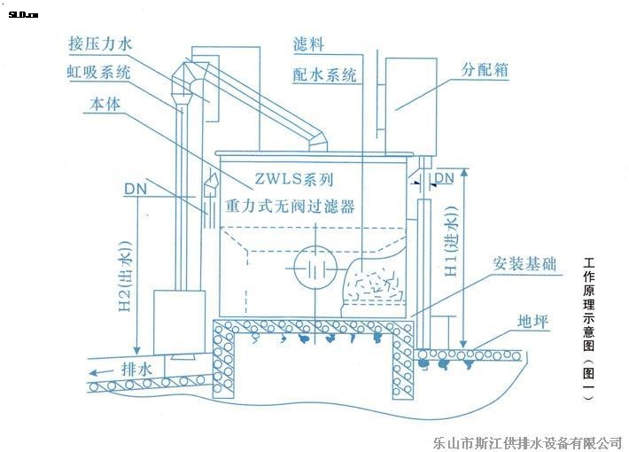 原水不斷自進水管進入虹吸上升管在輔助虹吸管的管口處,進入輔助虹吸管并沿該管下跌,在下跌過程中通過“抽氣三通”,并帶走“抽氣三通”側(cè)管內(nèi)的空氣,而“抽氣三通”側(cè)管是連接虹吸管系統(tǒng)倒置U型管頂部的,這樣,“抽氣三通”就抽吸了虹吸管系統(tǒng)倒置U型管頂部和虹吸下降管內(nèi)的空氣,由于虹吸下降管的下部管口在排水水封內(nèi)被水封住管口,于是倒置U型管頂部及虹吸下降管內(nèi)逐漸形成負(fù)壓,并且真空度逐漸增大,水封內(nèi)的水在虹吸下降管的液面從“反沖洗前,管內(nèi)最低水位”迅速上升,并越過倒置U型管頂部,與虹吸上升管內(nèi)的原水匯合,形成虹吸,原水沿虹吸下降管下跌,于是反沖洗開始了,清水自清水區(qū)沿數(shù)條連通管,清水管由上而下進入集水區(qū),從集水區(qū)通過網(wǎng)板、承托層,自下而上反沖濾料,使濾層處于膨脹,濾料相互摩擦、碰撞狀態(tài),被截留和吸附在濾料層內(nèi)的懸浮物等污物隨水流通過渾水區(qū),進入虹吸管系,沿虹吸上升管,虹吸下降管進入排水水封井,流至下水管網(wǎng)。在反沖洗過程中,清水區(qū)內(nèi)的水面迅速下降,同一體相隔的另一室的清水,進入正在反沖洗的一室內(nèi),參與反沖洗,以保證足夠的沖洗時間。當(dāng)清水區(qū)內(nèi)的水面降至虹吸破壞斗管口時,空氣自虹吸破壞斗的管口進入倒置U型虹吸管系的頂部,于是虹吸被破壞,虹吸管系內(nèi)的反沖洗水?dāng)嗔鳎礇_洗結(jié)束。同時,處于膨脹狀態(tài)的濾料層的濾料下落,原水仍進入渾水區(qū),經(jīng)濾料層,開始了又一個周期的過濾。如此周而復(fù)始地過濾,反沖洗,過濾……